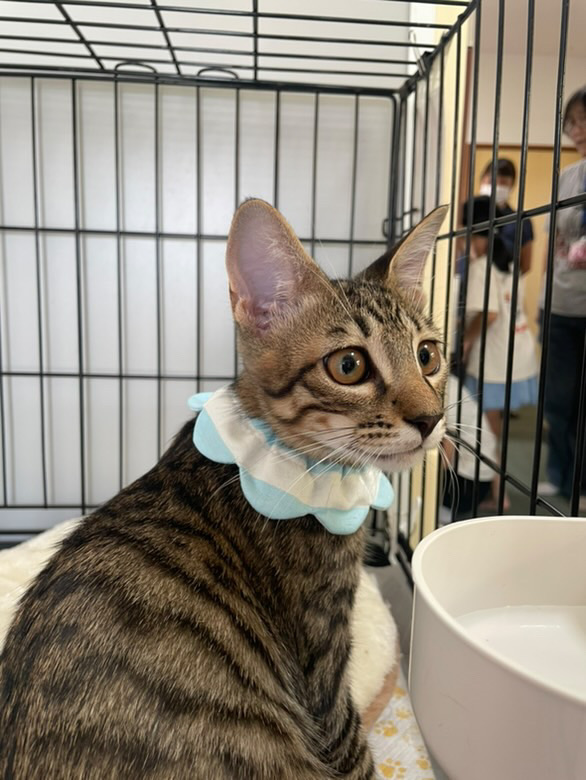経緯 | 午前10時頃に、今治バイパスを車で走行していると、片側2車線の右側で信号待ちをしていた時に左側の歩道より子猫が飛び出してきて、私に車の下に潜り込んでしまいました。後方にも沢山の車と反対車線も沢山の車が走行する状態の為、信号が青にかわりましたがそのまま発進出来ない状況と考えて後方の車に停まってもらい、私の車の下を覗き込んだら、右後方タイヤ内側に隠れている子猫が見えました。すると子猫が車道に飛び出してゆっくりと発進した後方の車に轢かれそうになった為、咄嗟に子猫を右手で掴み保護しました。 保護日:R7.6月27日 |