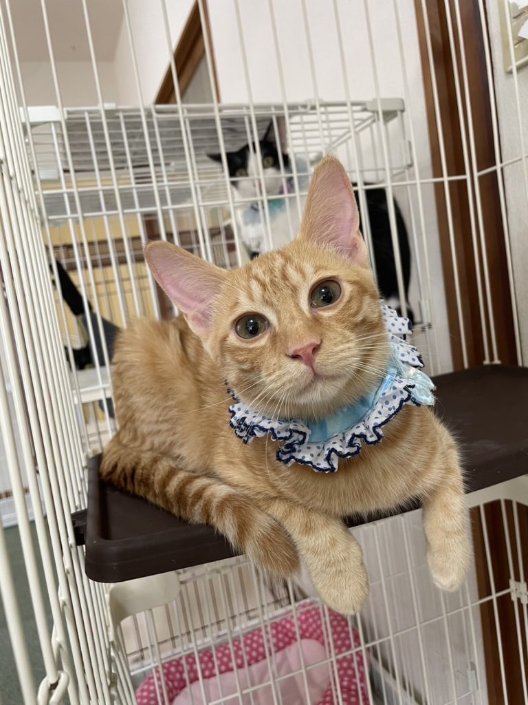 状態 | 健康診断 ☑ 検便 ☑ ノミダニ駆除 ☑ ワクチン接種 1回目 ☑・2回目 ☑(3種) 血液検査 保護時 □・2ヶ月後 ☑(エイズ白血病共に陰性)8/9 去勢手術 □ その他: |