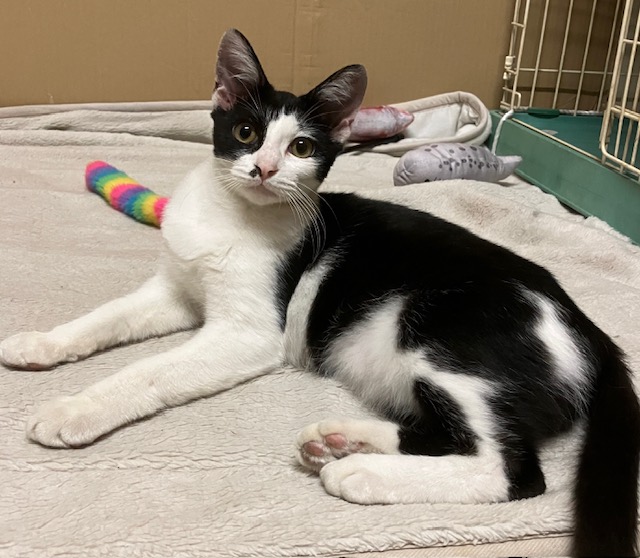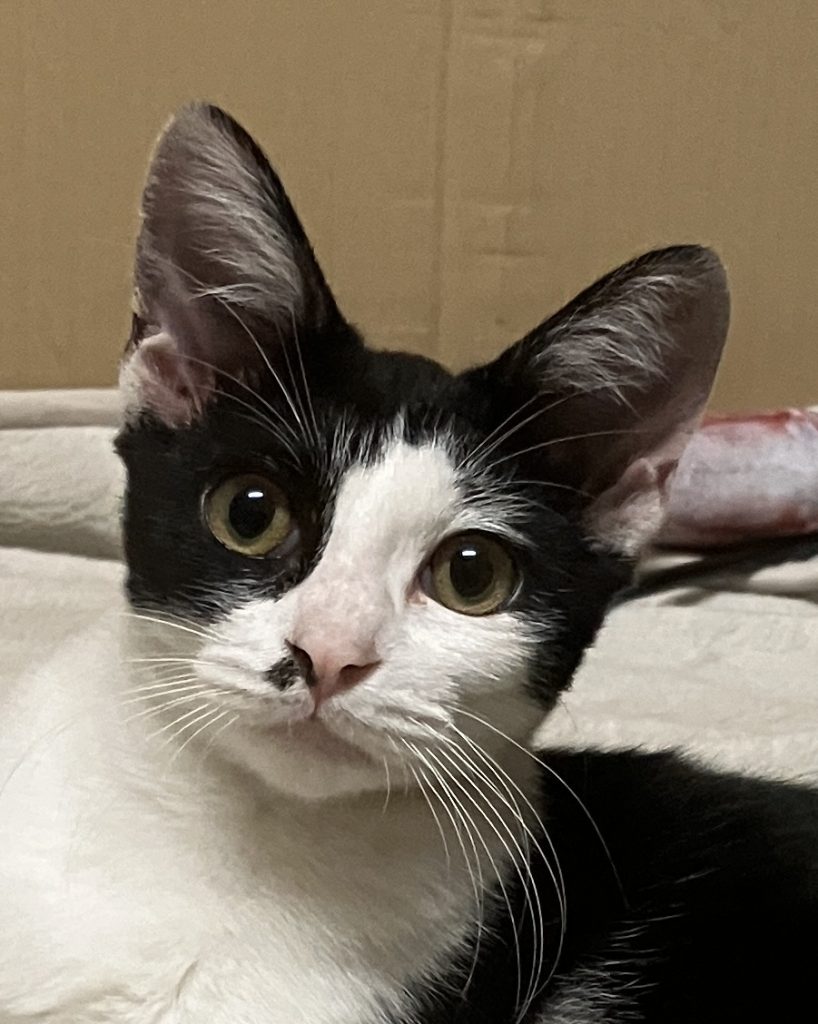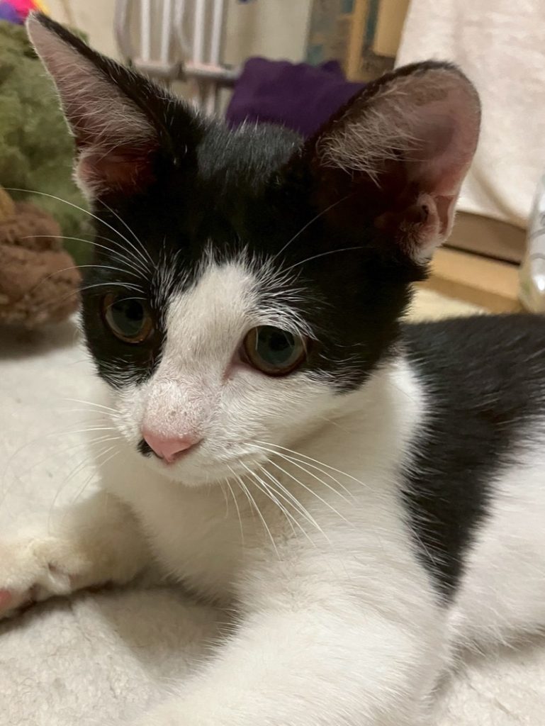 | 性格 | 人馴れしており、病院での診療時にもゴロゴロ♡ 抱っこも出来ますが、それ以上に遊んでほしいようですぐにじゃらし遊びを要求されます。 ハーフフェイスのマスカレードマスク柄が素敵なももちゃん これでもか!って言うくらいおっきな耳とお鼻のポチっとホクロもチャームポイントです。 |