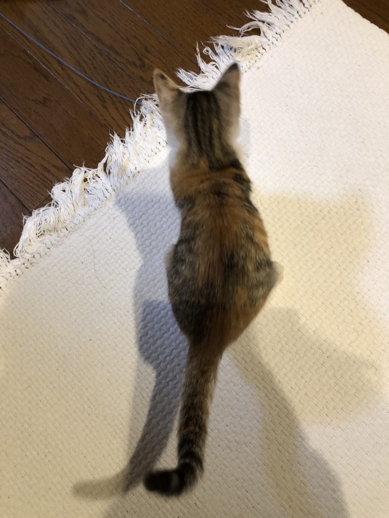 現在ちょうどガブガブ期です。尻尾も真っすぐに長く、柄は三毛猫とキジ交じりで、三毛猫もどきと言った風合いです。