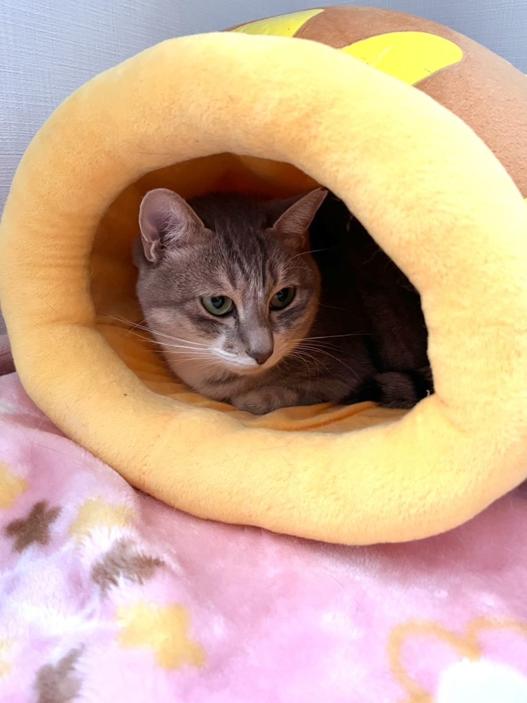 | 性格 | 人馴れも少しずつ進み、撫でること、ブラッシングは好きになりました。 お腹が空けば、鳴きながらすり寄ってきます。少し怖がりな性格で、ちょっとの異変は察知して隠れます。静かな環境を好みます。 同室の猫とはケンカはしませんが、距離を取ります。先住猫さんのいるお家より、1頭飼いの方が懐くのではないかと思います。 普段の様子をご覧ください→(インスタグラム) |